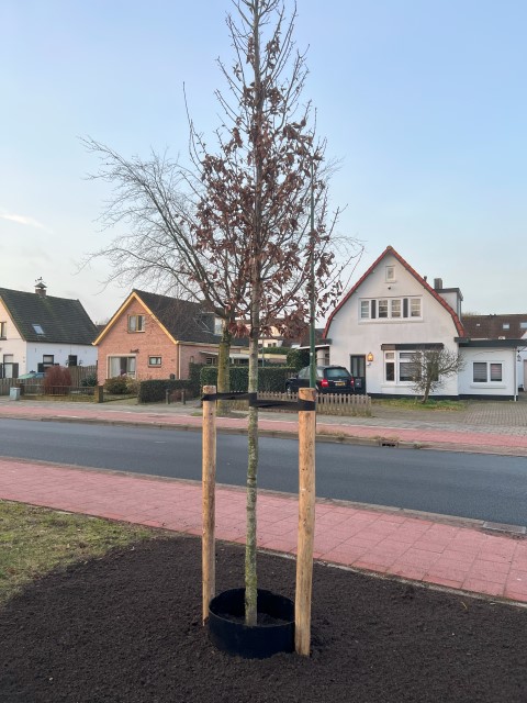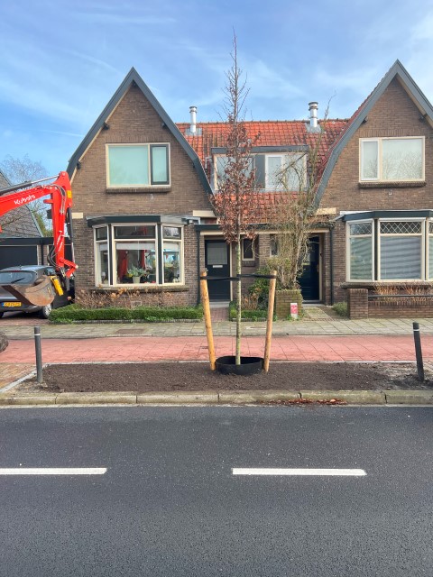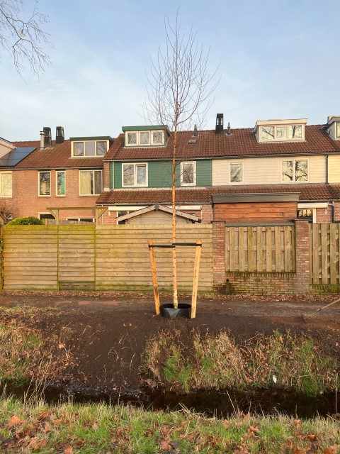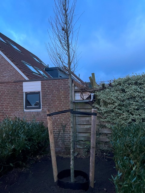 Boom niet in het midden van het vak geplaatst in verband met riool aansluiting huis. |