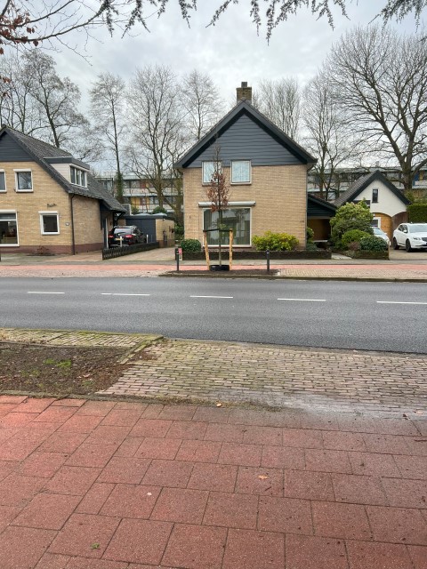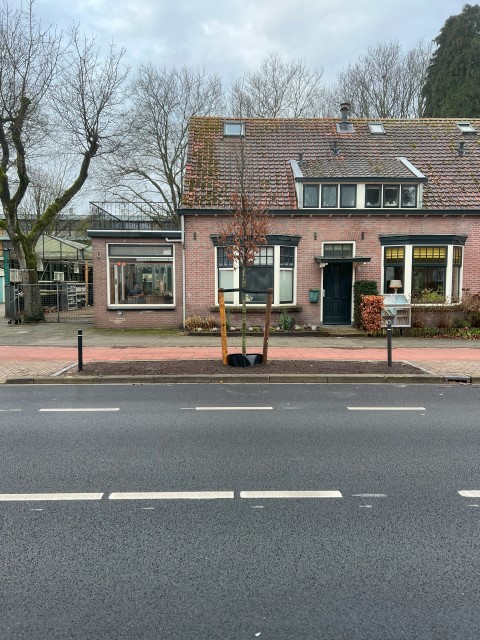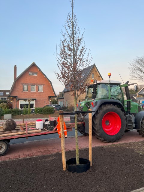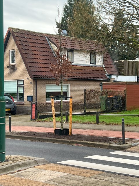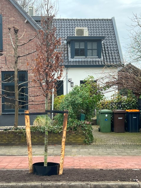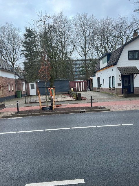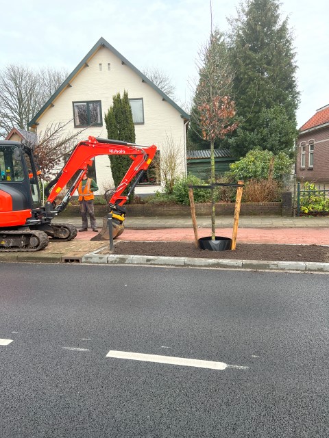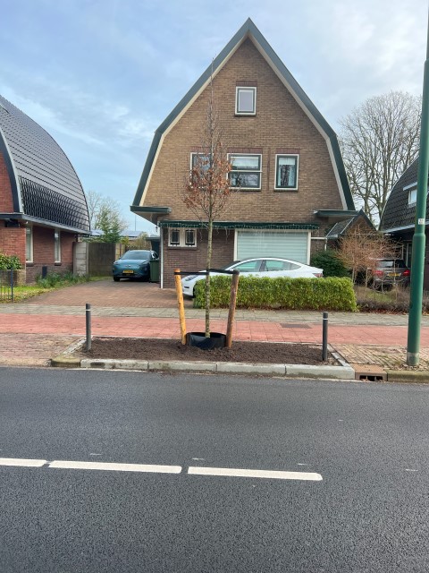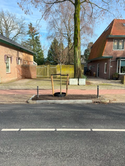 Boom redelijk in het middden van het vak geplaatst. Aan de rand van het vak bij oprit huisaansluiting.(links) Rechts de put. |