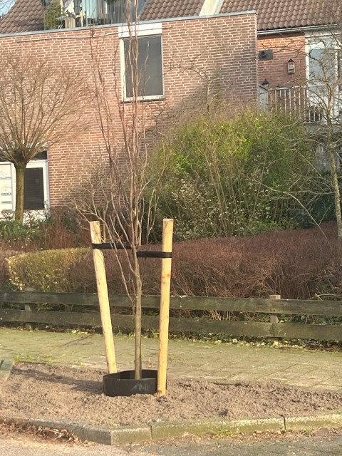 Boom redelijk in het middden van het vak geplaatst. Aan de rand van het vak bij oprit huisaansluiting.(links) Rechts de put. |